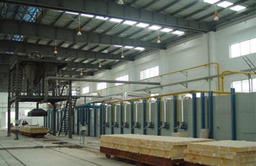 模殼焙燒爐爐體主要由殼體、襯體、加熱元件、拉車(chē)機(jī)構(gòu)、爐門(mén)升降機(jī)構(gòu)、焙燒小車(chē)及排氣閥門(mén)、溫控系統(tǒng)等組成。